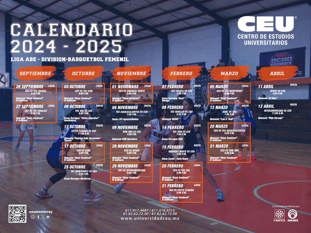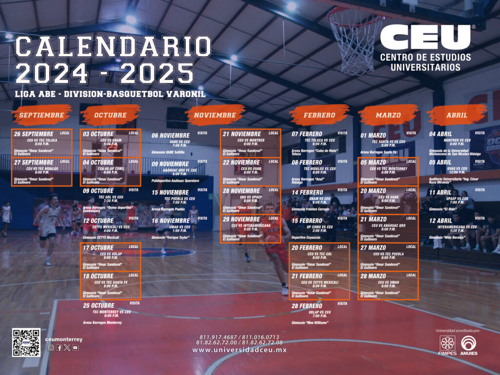 ¡Nuestros equipos están de vuelta en su lucha por el título de la Liga ABE! Los Gallos del CEU están listos para darlo todo, y queremos que formes parte de cada uno de sus encuentros. Te compartimos el calendario de partidos para que sigas cada enfrentamiento y los apoyes desde el Gimnasio “Prof. Omar Sandoval” o a través de la transmisión en vivo en la página de Facebook CEU Monterrey.